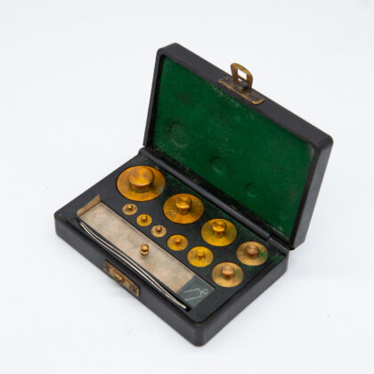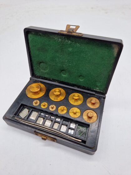 A boxed set of apothecary weights. Comes with brass weights for 1g up to 100g. It also features smaller weights from 1mg up to 500mg. This set is complete with weights, rider and tweezers spare for one of the 5mg weights. Its very rare to find a set like this so complete.