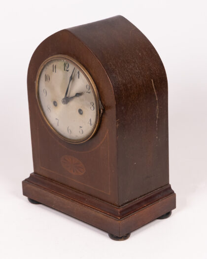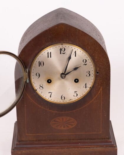 Antique arched mantel clock with decorative inlay, aged face, and brass bezel. A beautiful vintage timepiece.