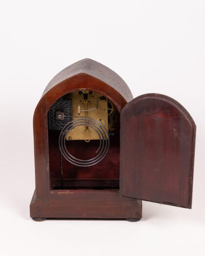 This is an antique mantel clock with a classic arched design. The clock features a wooden case with subtle decorative inlay on the base. The round clock face has black numerals on a aged white background, framed by a brass bezel. A hinged glass door protects the clock face, and the clock mechanism is visible from the rear. The overall condition reflects the clock's age, with some wear and patina on the wood and face, adding to its vintage appeal. This clock would make a handsome addition to any mantelpiece or shelf.
