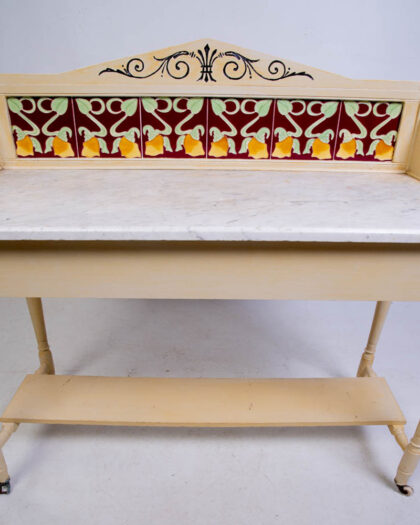 This is an antique washstand featuring a marble top and a decorative tiled back in the Art Nouveau style. The washstand has a cream-painted wooden frame with turned legs and a display shelf. The tiled back features a floral Art Nouveau design in red, green, yellow and black.