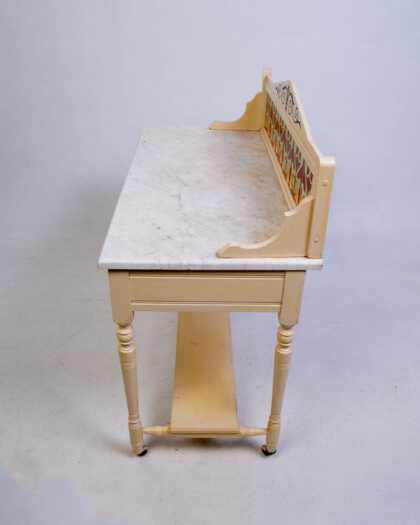 Antique washstand with marble top and Art Nouveau tiled back. Cream painted wooden frame. Some wear consistent with age. Display shelf.