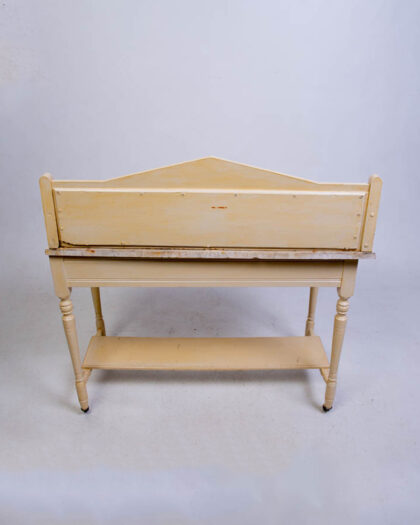 The marble top is a cream shade. The wooden frame is cream paint. The frame shows signs of wear consistent with age, including some areas of discoloration and minor paint loss. Could be displayed in a bathroom, bedroom, or living room as a decorative piece.