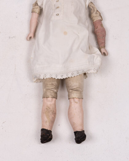 This is an antique doll in need of some TLC. The doll features a bisque head with painted features, brown hair, a white dress, and composition body with shoes. The doll is missing material on the arms and has some wear and dirt throughout. This doll is a great restoration project or addition to a collection of antique dolls.