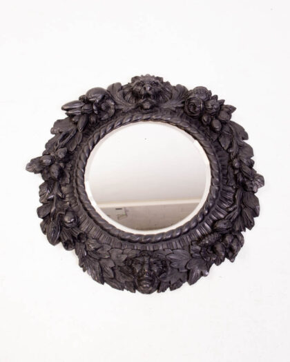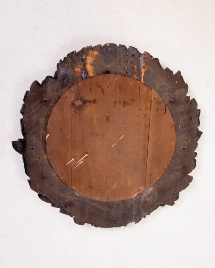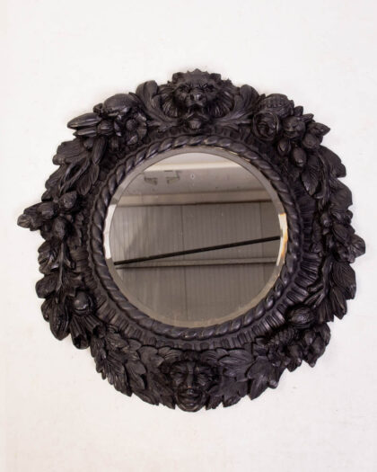 This is an antique Black Forest mirror featuring heavily carved floral and lion details. The mirror has a round form with a dark wood finish. The frame features detailed carvings of leaves, roses, and lion heads, all characteristic of the Black Forest style. The wood has a deep, rich tone with a slight patina from age. The mirror glass is clear and in good condition. The back shows signs of wear and age, with old nail holes and a slightly distressed finish. This mirror would make a striking addition to any living room, bedroom, or hallway, adding a touch of rustic elegance to the space.