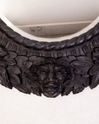 Antique Black Forest mirror featuring heavily carved floral and lion details. Round form. Dark wood finish. Good condition.