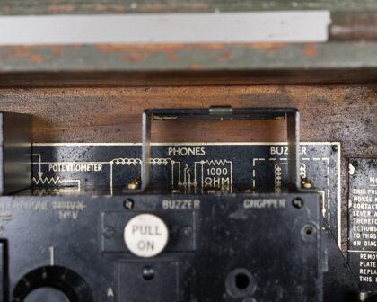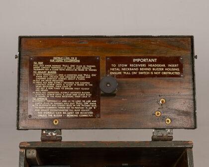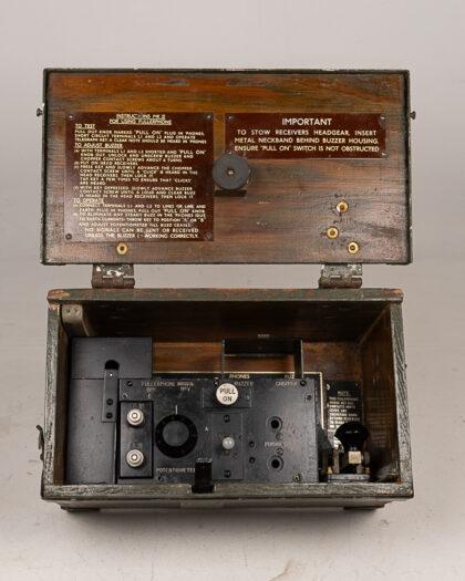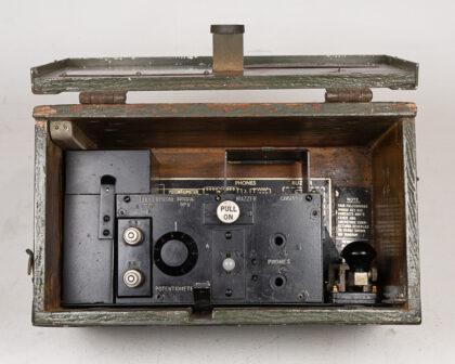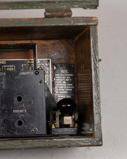 The Fullerphone is a vintage military communication device, housed in a sturdy wooden case with visible signs of wear, adding to its historical charm. The exterior is painted in green with stenciled markings, indicating its military use. Ideal for collectors of military electronics or historical communication equipment.