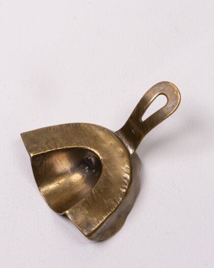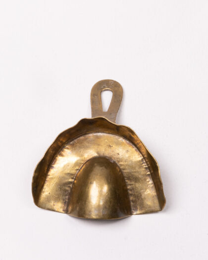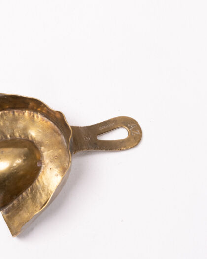 This is an antique dental impression tray crafted from brass. It has 'Germany' stamped on the handle, indicating its origin. The tray shows signs of age and use, adding to its vintage charm. This would be a fascinating item for collectors of medical memorabilia or those interested in dental history, or it could serve as an interesting decorative piece. In good condition.
