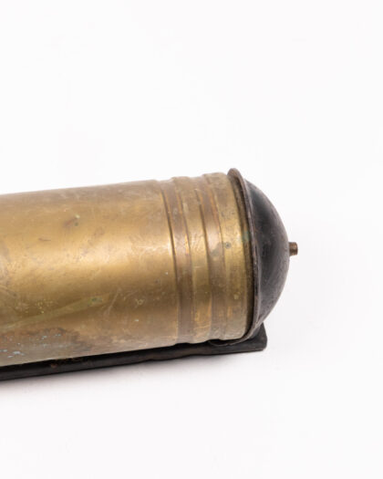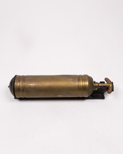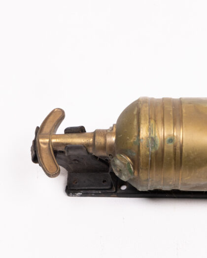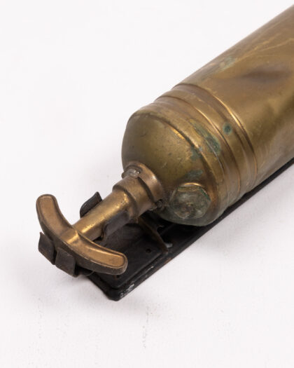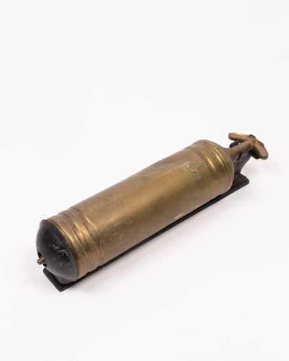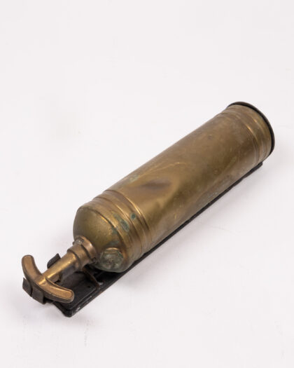 This is an antique brass fire extinguisher, complete with a mounting bracket. It would make a unique decorative piece for the home or office. The fire extinguisher shows signs of age, including some tarnishing and minor dents, adding to its character. A unique item.