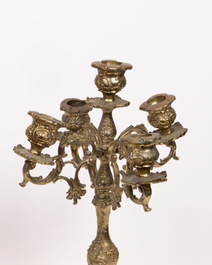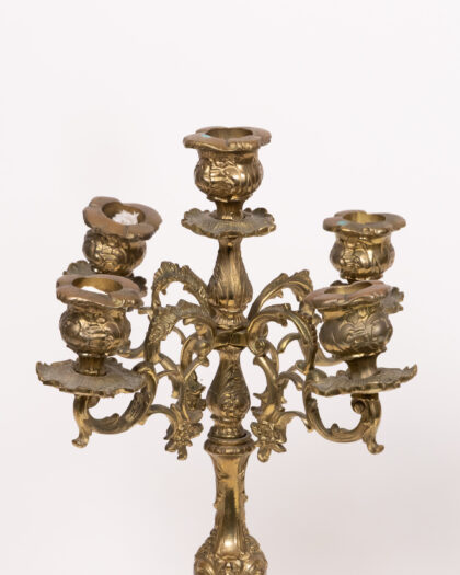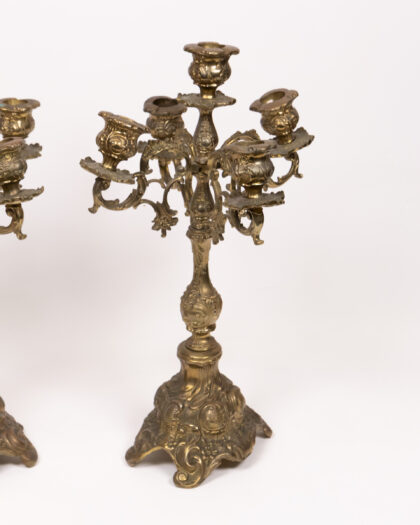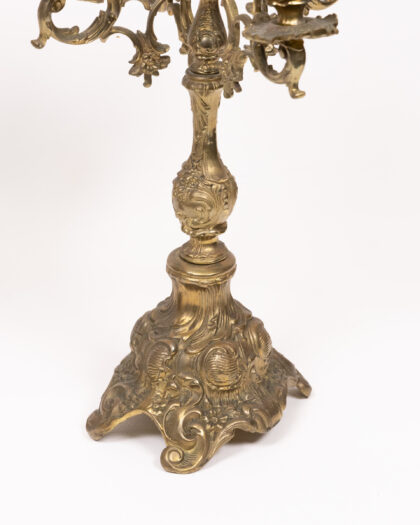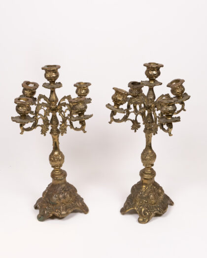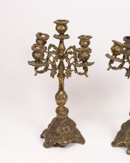 This is a beautiful pair of antique brass candelabras, each featuring five arms for holding candles. The candelabras are adorned with intricate floral detailing throughout, adding to their charm and elegance. The ornate base provides stability and complements the overall design. These candelabras are in excellent vintage condition, showing minor signs of age appropriate wear. These candelabras make a stunning addition to any dining room, living room or special occasion setting.
