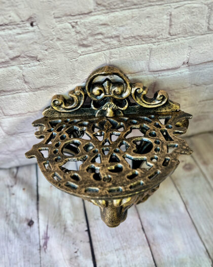 Elevate your home or garden decor with this magnificent cast iron lion head plant stand. This wall-mounted bracket features a noble lion face, complete with flowing mane and stately expression, crowned with an ornate crest and scrollwork. A sturdy latticework holder is designed to cradle your favourite potted plant. Crafted from durable cast iron, it boasts a beautiful antique bronze finish, with highlights that expertly accentuate the intricate, three-dimensional details. Suitable for indoor and outdoor use. H: 27.5 cm, W: 22 cm, D: 16 cm. Weight: 3.40kg.