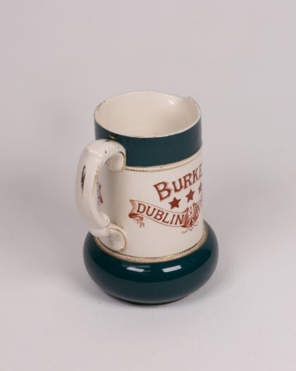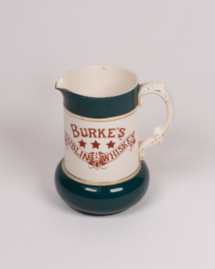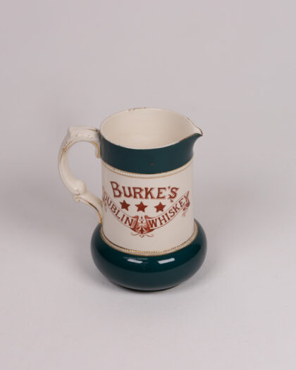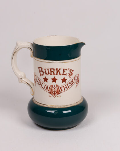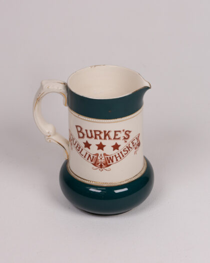 This is a beautiful antique ceramic jug advertising Burke's Dublin Whiskey. It features a cream-colored body with green bands at the top and bottom. The logo 'Burke's Dublin Whiskey' is displayed in red with gold trim along the top and bottom edges. The jug is in very good condition for its age, showing only minor wear. A perfect addition to a breweriana collection or vintage home bar.