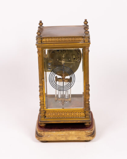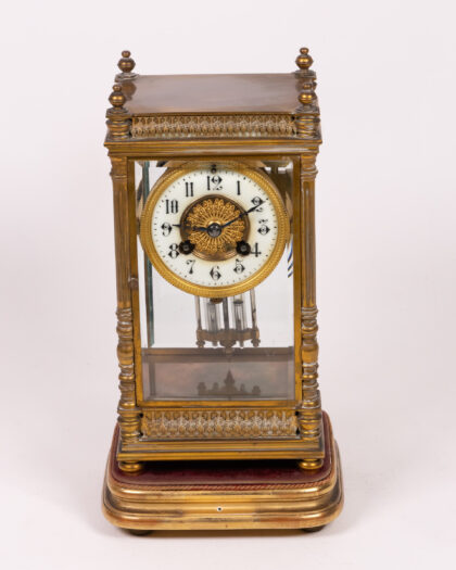 Elegant antique French ormolu mantel clock with glass case. A stunning timepiece in good condition for its age.