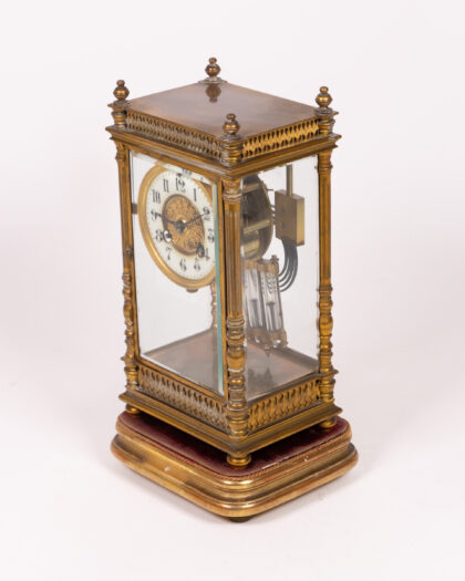 This is a beautiful antique French ormolu mantel clock, featuring an elegant glass case. The clock has a classic design with intricate detailing on the ormolu (gilded bronze) frame. The white enamel dial is marked with black numerals. The clock has a pendulum and key. This exquisite timepiece would make a lovely addition to any home. It's in good condition for its age, with some signs of wear commensurate with age. Add a touch of vintage charm to your mantelpiece, bookshelf, or desk with this remarkable clock.