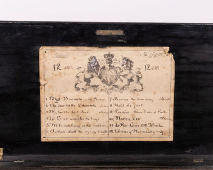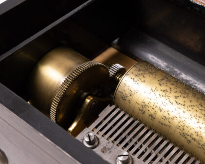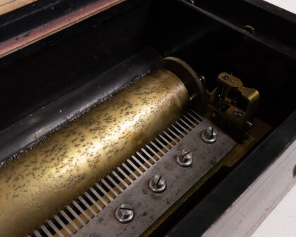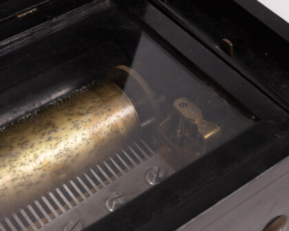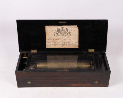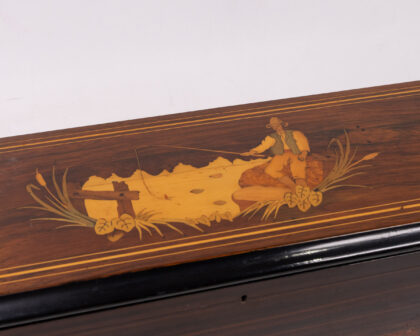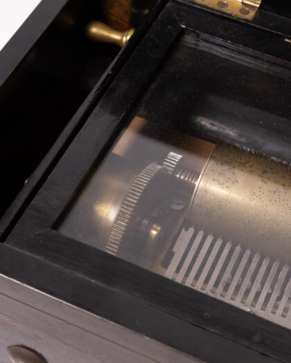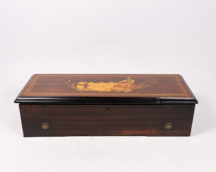 This antique music box is a beautiful piece that combines functionality with decorative charm. Crafted from wood, its exterior features a striking contrast of dark brown and black, accentuated by gold details on the internal mechanism. The top of the box is inlaid with a marquetry design depicting a scene with figures and foliage. Upon opening, the box reveals a glass-covered compartment showcasing the intricate musical mechanism. The inner lid features a paper with the original hand-written list of 12 airs. This music box is not just a musical instrument but also a piece of art, perfect for collectors or anyone who appreciates vintage items. All comb teeth present and in perfect condition.