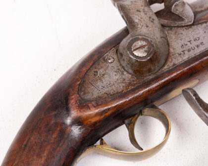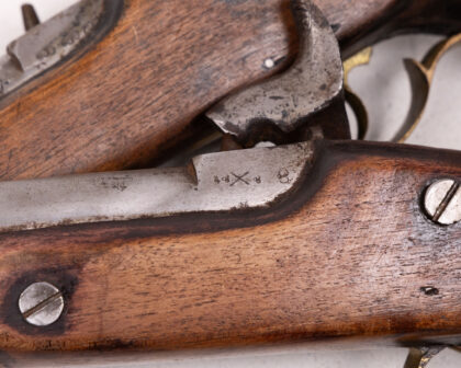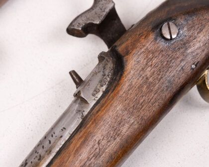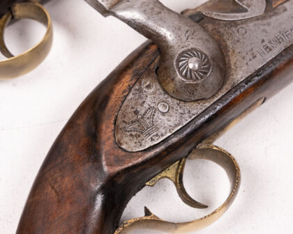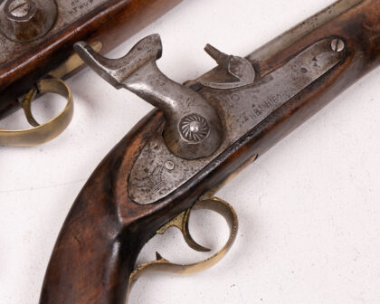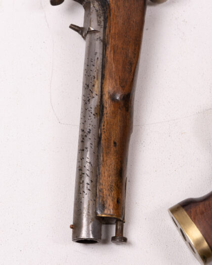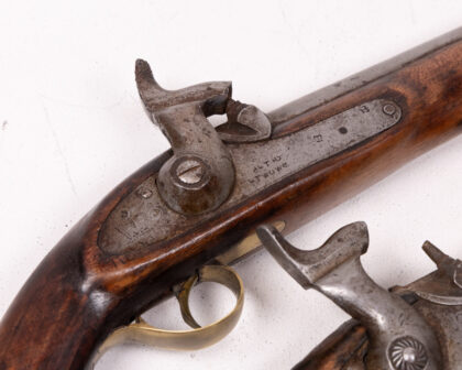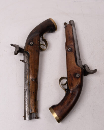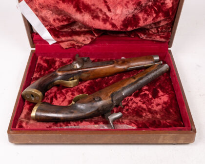 A cased pair of percussion cap duelling pistols. These pistols feature wooden stocks, likely walnut, with brass accents. The barrels and firing mechanisms appear to be steel or iron. One pistol has clear markings and engravings. The set is housed in a wooden case lined with deep red velvet. The age is estimated to be mid-19th century. Condition: Good, showing signs of age and use commensurate with age. Patina and wear are visible.