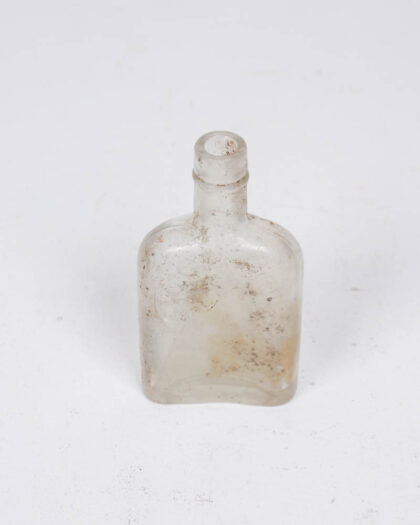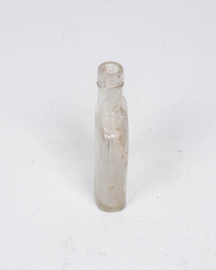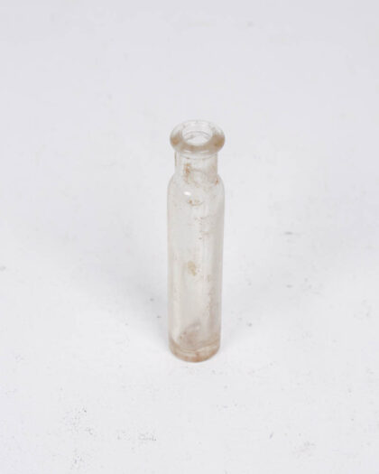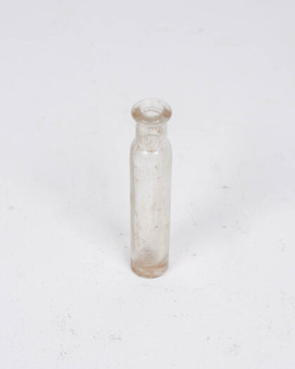 Antique clear glass bottle. Square base and cylindrical neck. Distressed condition with some marks. Decorative use or upcycling.