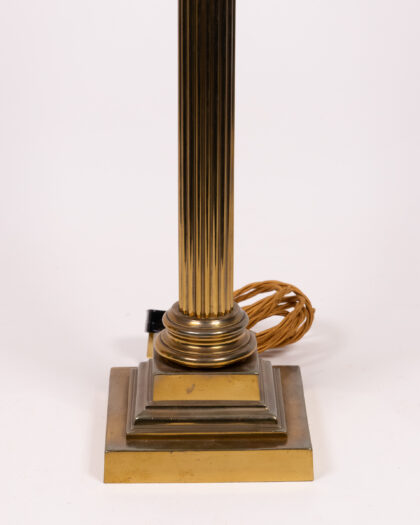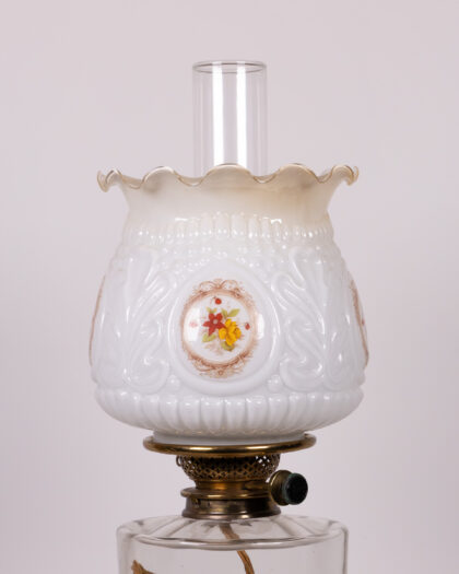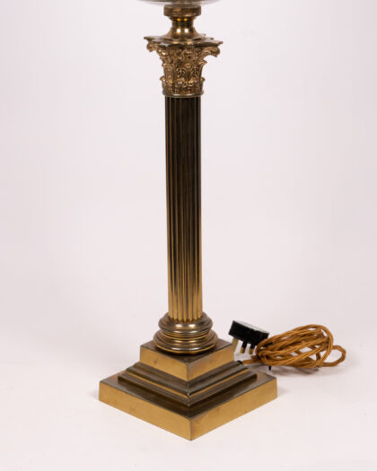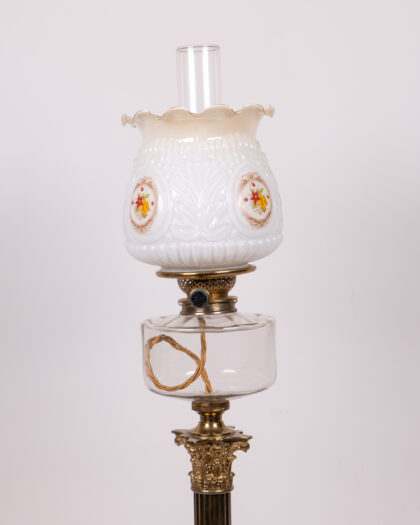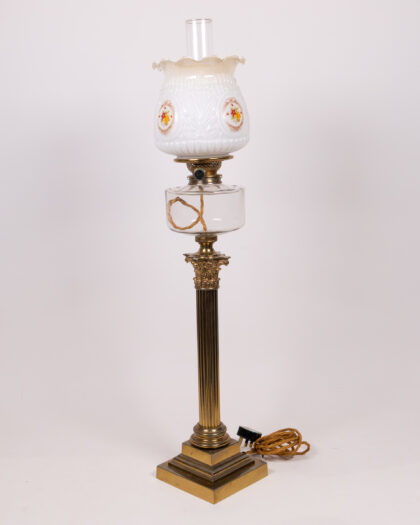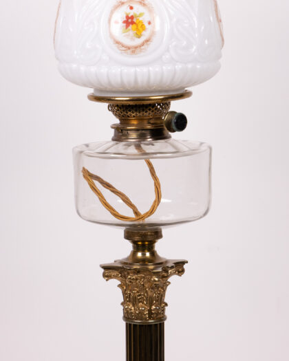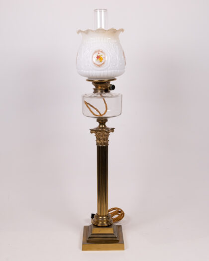 Discover this impressive antique oil lamp, meticulously converted to electricity for modern convenience while retaining its original charm. Standing at a stately 91cm, this lamp features a classical Corinthian column and a fluted brass stand that exudes timeless elegance. The clear glass oil reserve, now housing the electrical wiring, is beautifully complemented by intricate brass detailing. Crowned with a white glass shade adorned with a delicate floral pattern, this lamp casts a warm, inviting glow. Its sturdy square base ensures stability, making it a perfect statement piece for a living room, lounge, or grand bedroom, adding a touch of historical sophistication to any interior.
