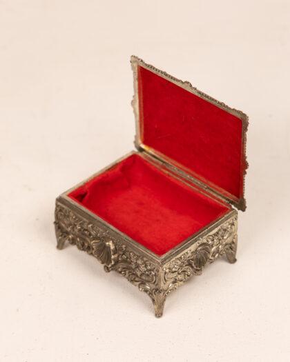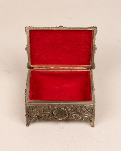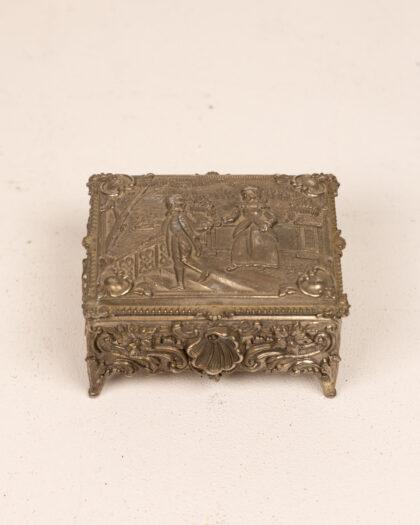 This antique metal box features elaborate engravings depicting a historical scene. The craftsmanship includes ornate floral and shell motifs around the edges. It is in good condition, showcasing a patina that adds to its vintage charm. Ideal for collectors or as a decorative piece. Measurements: approximately 10cm x 8cm x 5cm.