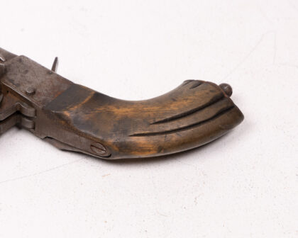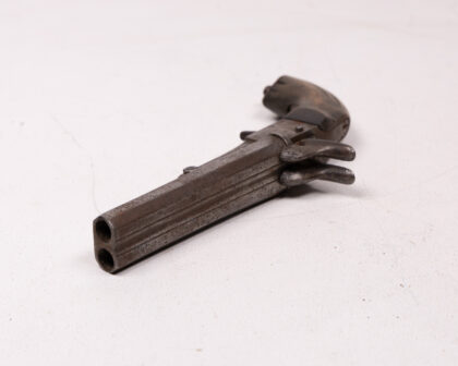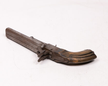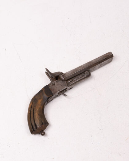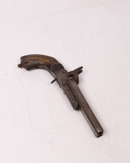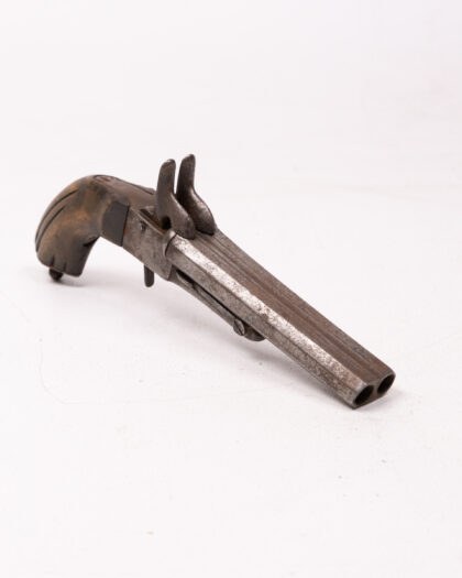 This is an antique double-barrel pinfire pistol, a fascinating piece of historical weaponry. The pistol features a wooden handle and a metal frame and barrels. The pinfire ignition system, a now-obsolete technology, adds to its vintage charm. Given its age, the pistol shows signs of wear, which enhances its character and story. A unique collectible item, perfect for display or for adding to a collection of historical firearms.