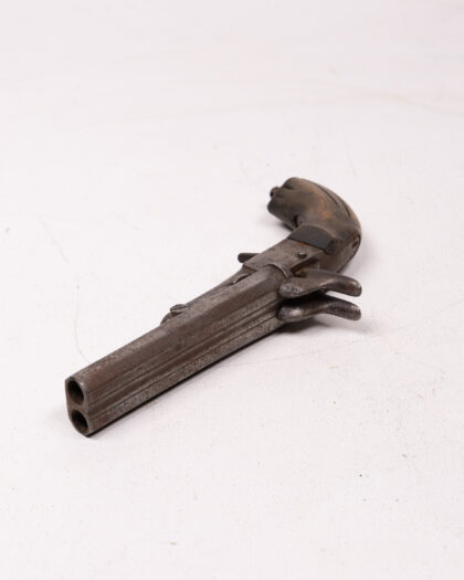 Antique double barrel pinfire pistol with wood handle and metal frame, a rare collectible. Signs of age add to vintage charm.