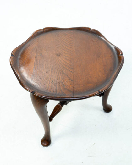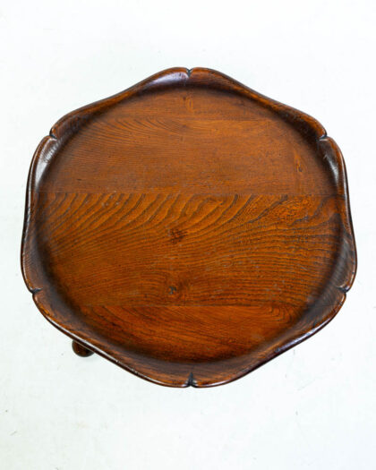 Antique elm side table with a scalloped-edge top and turned legs. Rich brown colour and visible wood grain. In good condition with signs of wear.