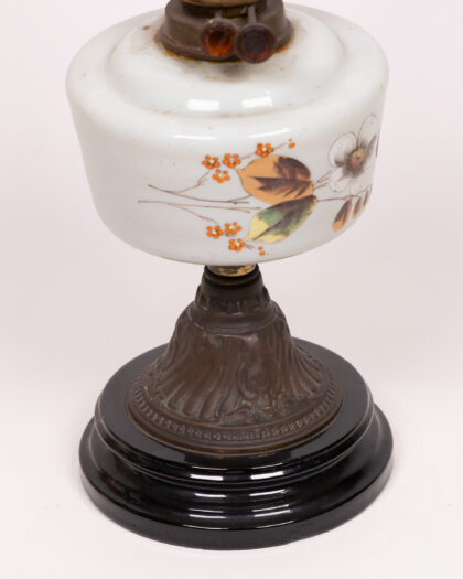This is a vintage oil lamp with a white opaque glass body decorated with orange and brown flowers and leaves. The base is bronze coloured metal with black accents and a clear glass chimney. The lamp has two amber-coloured knobs on the side to adjust the wick. The overall condition is very good for its age, with only minor wear and tear, making it a charming piece of vintage lighting. Perfect for adding a touch of rustic charm to any room.