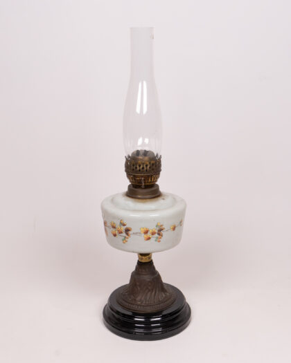 Vintage Floral Oil Lamp with white glass body, bronze metal base, and clear glass chimney. Decorative and functional lighting.