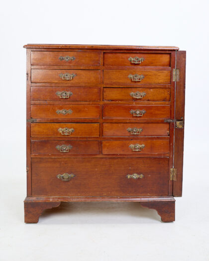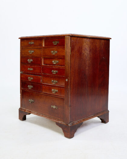 This is an antique apothecary chest in the Georgian style. It features a multitude of small drawers, each adorned with brass handles. The wooden construction displays a rich, warm patina, indicative of its age. The chest is likely made from oak or a similar hardwood. The brass handles have a tarnished finish, adding to the chest's antique charm. The chest has a side opening cabinet. The chest is in good condition, with wear consistent with its age and use. This apothecary chest would make a unique addition to a living room or library, adding a touch of old-world charm.