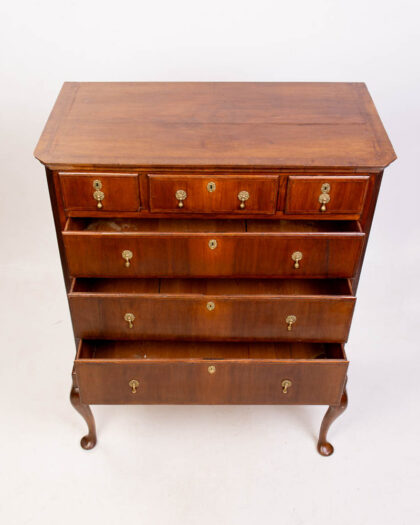 This is a fine example of a Georgian chest of drawers crafted from rich wallnut, dating back to the early 19th century. The chest features a classic design with four graduated drawers, providing ample storage space. Above these, there are three smaller drawers. Each drawer is fitted with ornate brass handles and escutcheons, adding a touch of elegance to the piece. The chest stands on bracket feet, typical of the Georgian period. The mahogany exhibits a deep, warm brown colour with a lustrous finish, enhancing the wood's natural grain. The item is in excellent condition, with minimal signs of age. Some wear to the wood commensurate with age is apparent. This chest of drawers would be a beautiful and functional addition to a bedroom or living room, bringing a touch of Georgian elegance to any space.