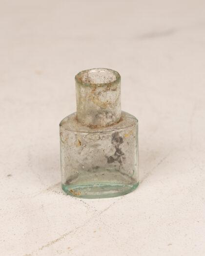 Antique glass ink bottle with a delicate green tint. The bottle is rectangular with rounded corners. It features a thick lip and a small opening. The glass shows signs of age with some dirtiness inside and out, but it appears to be intact with no cracks or chips. The overall condition is fair, with some age-related wear. 6cm high
