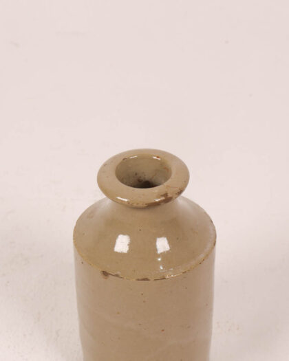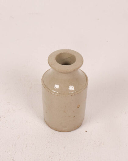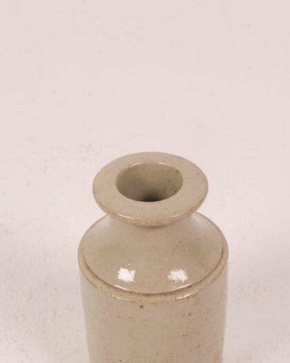 This is an antique stoneware jar featuring a cylindrical body and a distinct round neck. The piece is made of grey-toned stoneware. The jar exhibits signs of age, including minor surface wear and a slightly rustic texture. The simple form and neutral colour make it a versatile piece for vintage-style home decor. The jar can be displayed in a living room, kitchen, or bedroom.