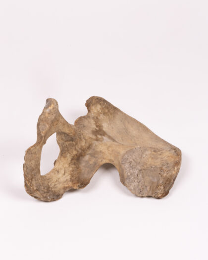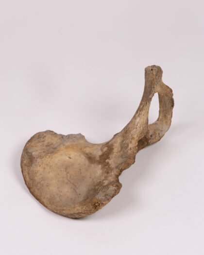 This is a naturally aged animal pelvic bone, likely from a domestic farm animal. It has a weathered and worn appearance with a light brown and cream colour. The bone shows natural imperfections and textures, adding to its rustic and unique charm. This piece would be a great addition to a collection of natural history items, a curiosity cabinet or as a decorative piece for a rustic or gothic-themed room.