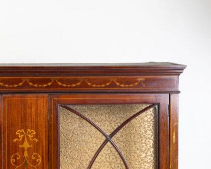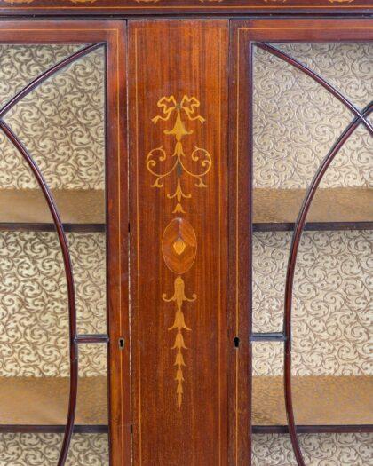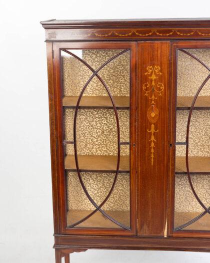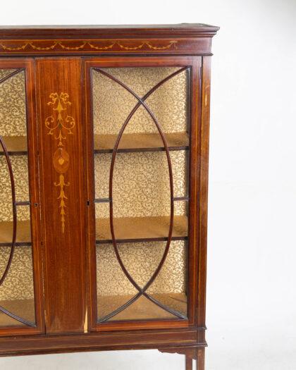 Antique mahogany display cabinet with inlaid details and glazed doors. Perfect for displaying collectibles. Some age-related wear.
