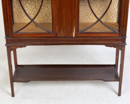 Elegant antique mahogany display cabinet featuring intricate inlaid detailing and a glazed front with decorative glass panels. The cabinet sits atop a matching stand with a shelf. The interior is lined with a patterned fabric. This piece offers both storage and display options. Some wear consistent with age, particularly a crack to the veneer at the bottom of the cabinet doors.