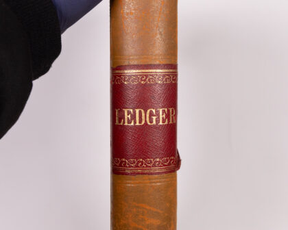 This is an antique ledger book, bound in brown leather with detailed gold accents on the spine. The book features a red leather spine label with 'LEDGER' embossed in gold lettering. The pages are filled with handwritten entries, providing a glimpse into the past. The corners are reinforced, and the overall condition shows wear commensurate with age, enhancing its antique charm. The leather has a rich patina, and the paper exhibits signs of age, giving it a unique character. This item would make a great decorative piece.