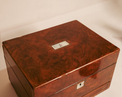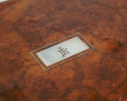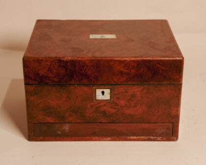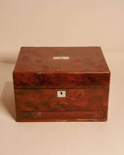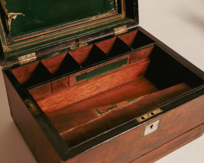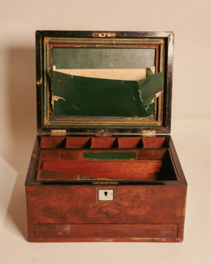 This writing box features two spring-loaded drawers which can be opened with the press of the two buttons under the lid; one drawer comes out of the front and the other out of the right side. This box locks and is complete with the key.