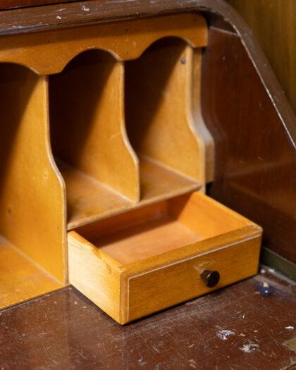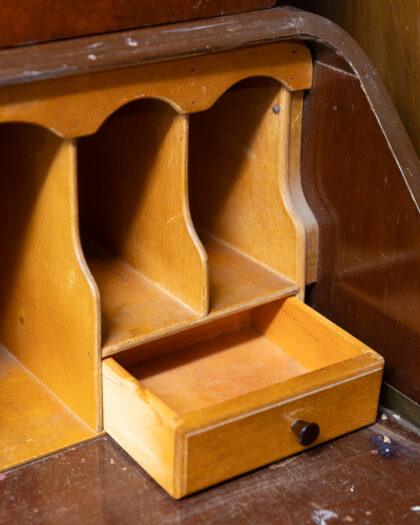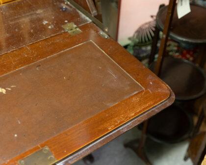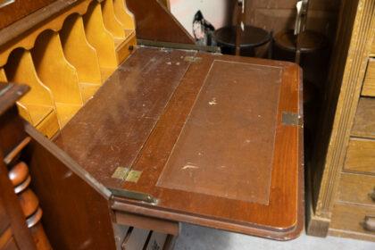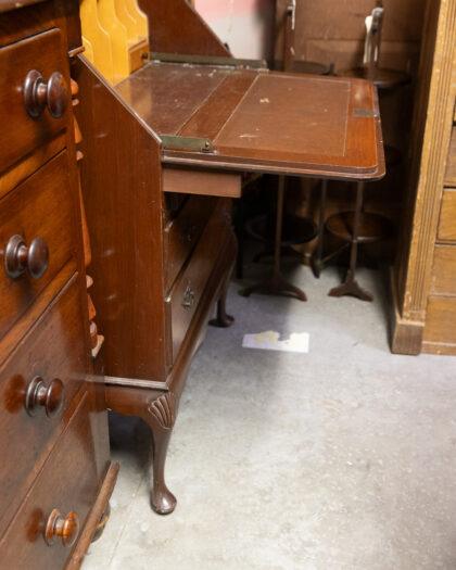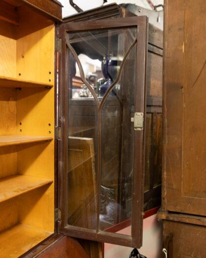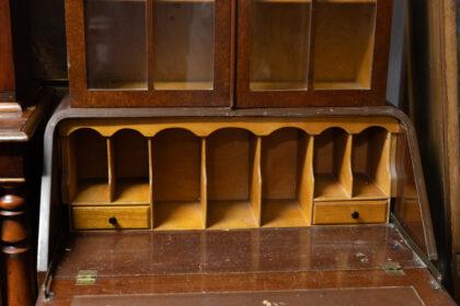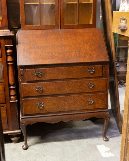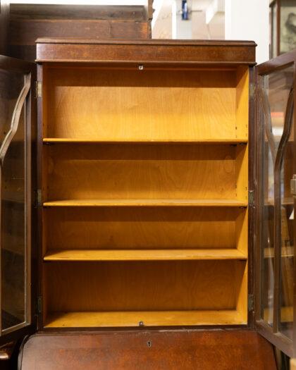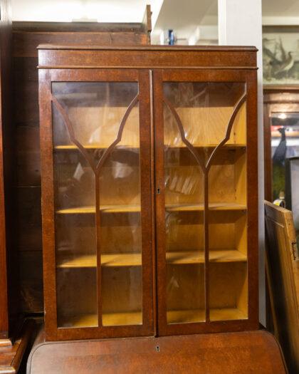 This exquisite antique mahogany bureau features a beautifully detailed glass cabinet above, perfect for displaying your cherished items. The lower section offers ample storage with three spacious drawers, each adorned with elegant handles. Its timeless design and craftsmanship make it a stunning addition to any home.