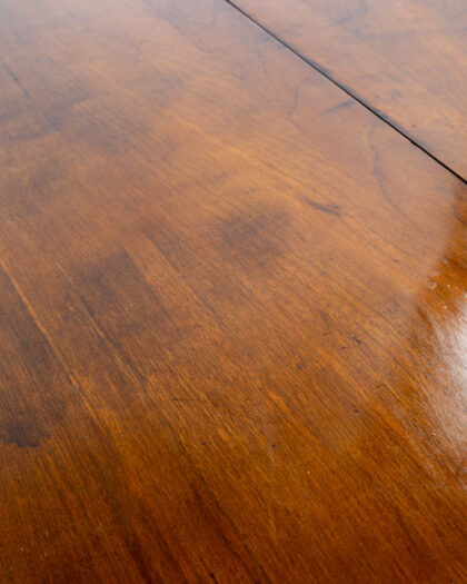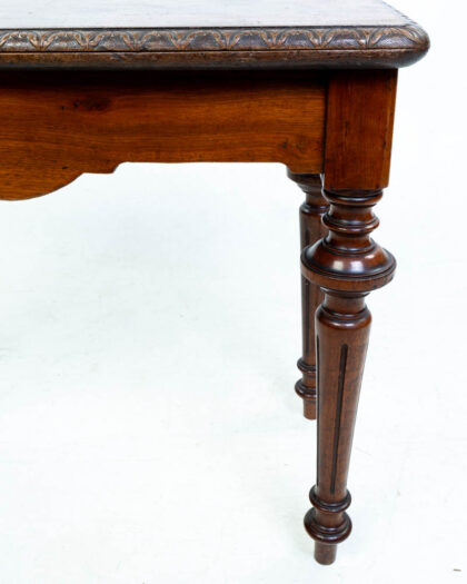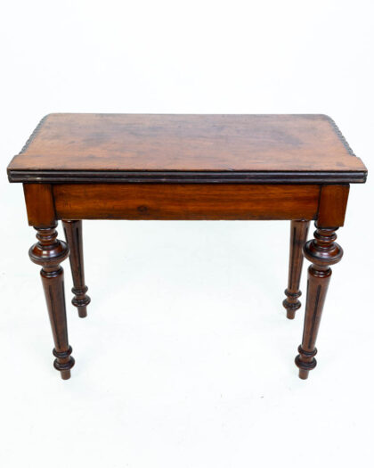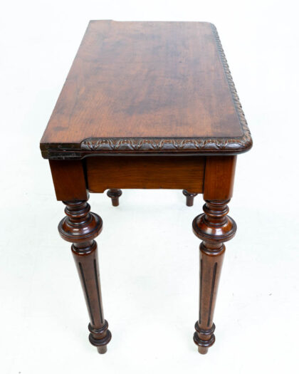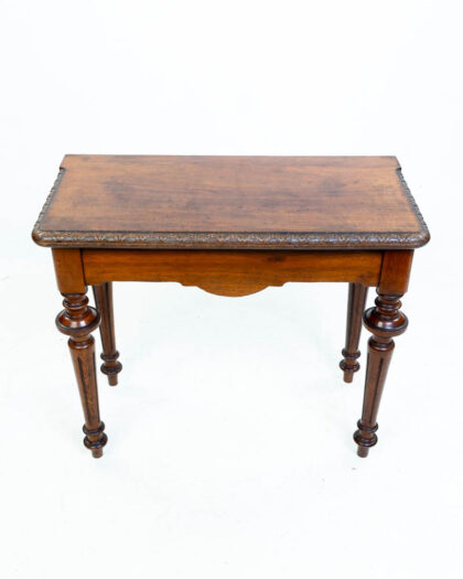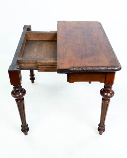 This is an antique mahogany drop leaf table dating back to the 19th century. The table features a rectangular top with a carved edge, supported by four bobbin-turned legs. The table has two drop leaves, which can be raised to create a larger surface area. The wood has a rich, warm patina from age. There is some wear consistent with its age. This table would look great in a dining room, living room, or library.