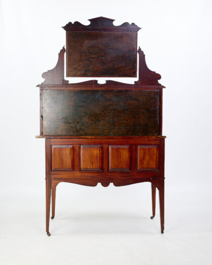This antique washstand features a marble top and a mirror. The wood construction has carved details, adding character to the piece. The base of the washstand has a cabinet for storage. Above the cabinet, a marble panel adds an elegant touch. The mirror is framed in wood with carved elements at the top. The overall design suggests an early 20th-century aesthetic. Some wear consistent with age. Would display well in a bedroom or bathroom setting.