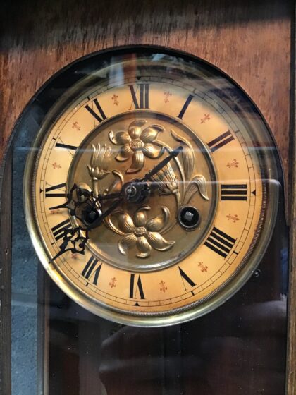 Complete and working wall clock with brass relief and amber face, and strong patination to clockcase.