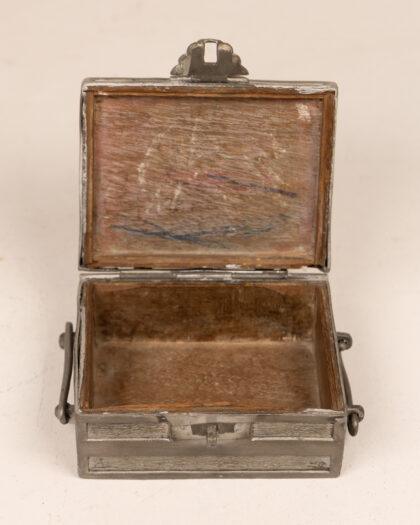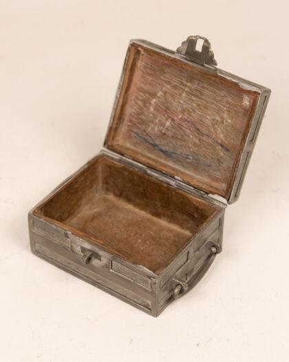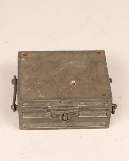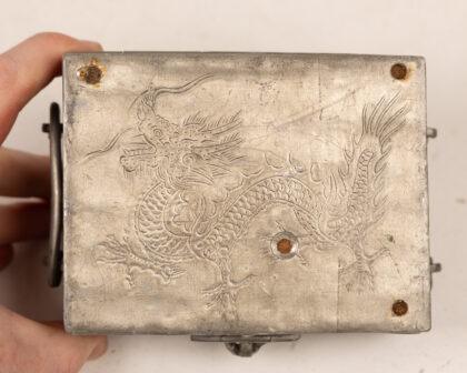 A vintage metal box featuring intricate dragon engravings, perfect for collectors.