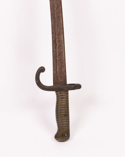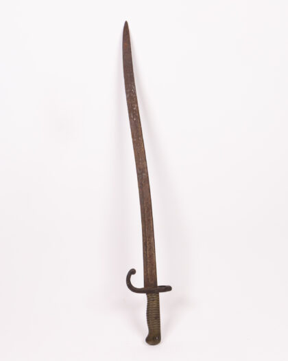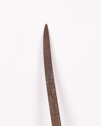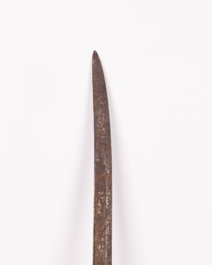 This antique sword features a curved metal blade and handle. The sword shows its age, with a patina and wear on the blade and handle. The handle is a dark metal colour with a curved guard. This item would make a great addition to any collection or as a unique display piece. Its worn appearance adds to its authenticity and charm.