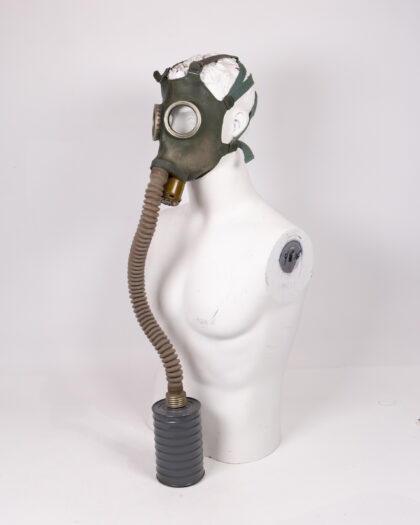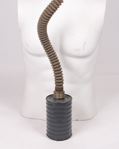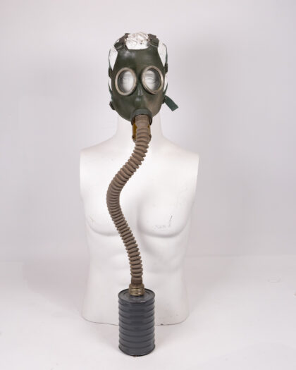 Antique military gas mask with green rubber facepiece, corrugated hose, and grey filter. Collectible military memorabilia.