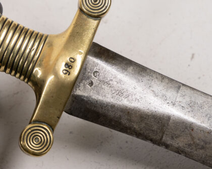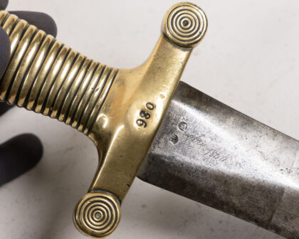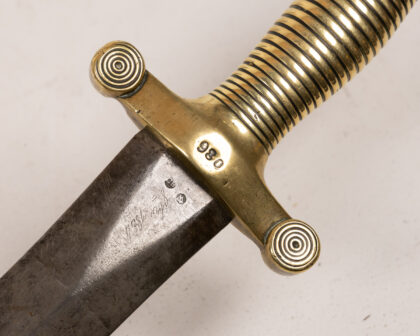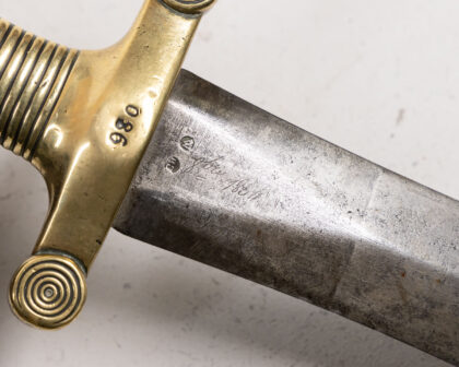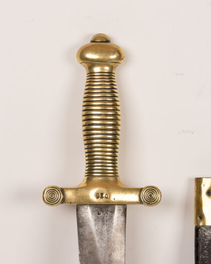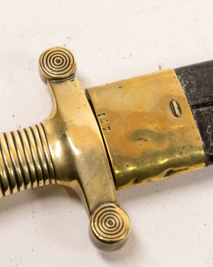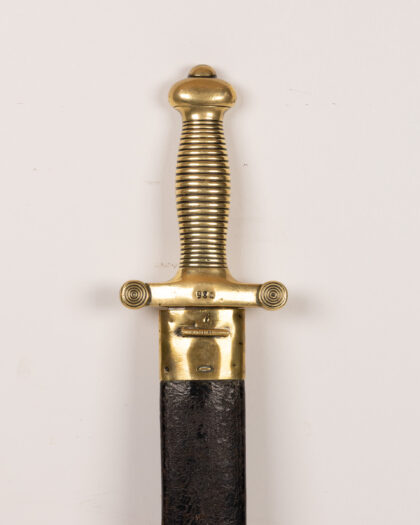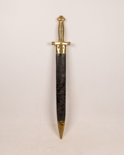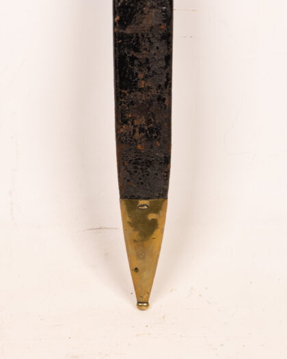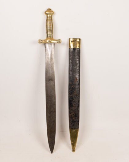 Antique infantry sword with brass hilt and leather scabbard. Fair condition with age-related wear. Ideal for collectors of militaria.
