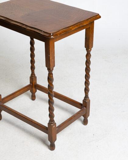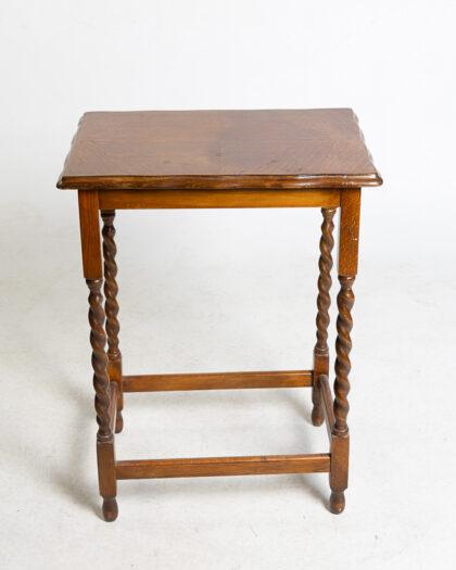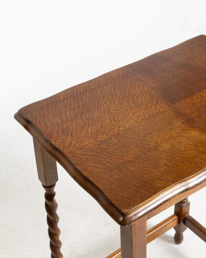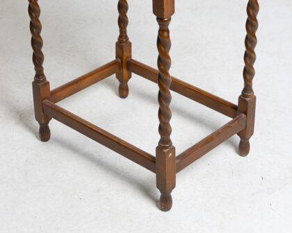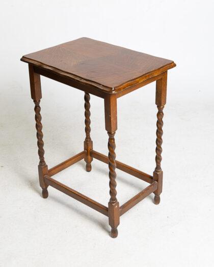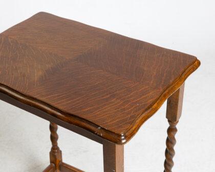 This is an antique side table crafted from oak, featuring elegant barley twist legs. The tabletop showcases a beautiful wood grain pattern. It stands in good condition, exhibiting minor wear consistent with its age. Ideal as an accent piece or for displaying small items.