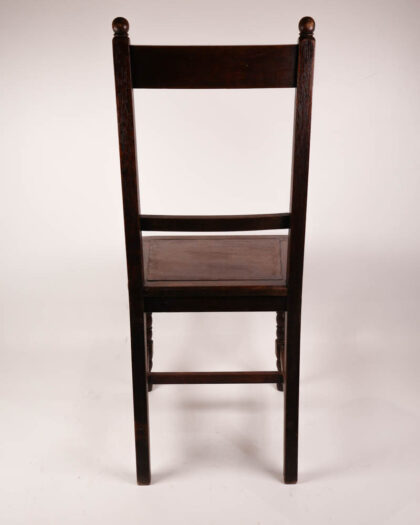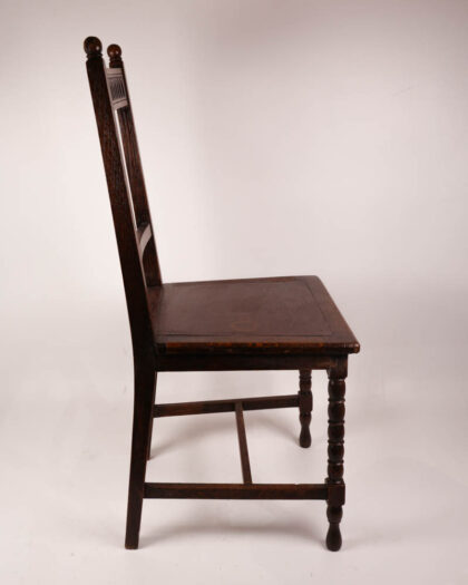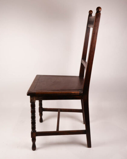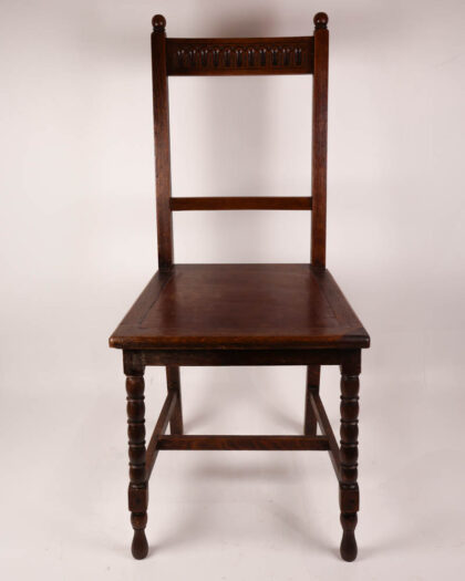 This is an antique oak chair featuring bobbin-turned legs, which are characteristic of the era. The back has a simple design with a carved top rail, featuring a repeating decorative pattern. The chair has a square seat. The dark wood finish shows its age with a patina. It's a sturdy chair for everyday use in a living room or dining room.
