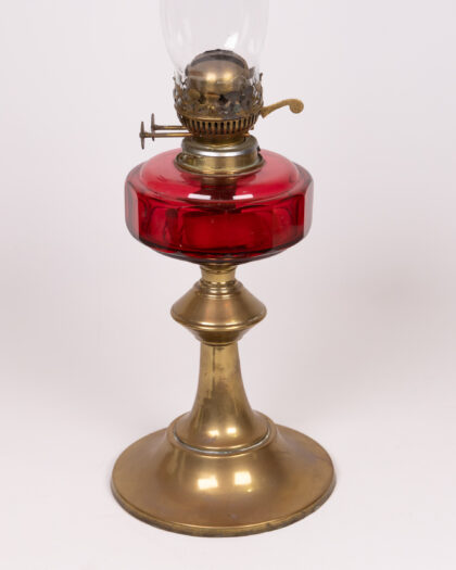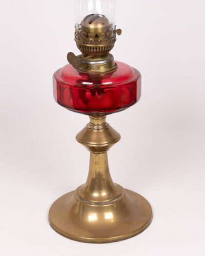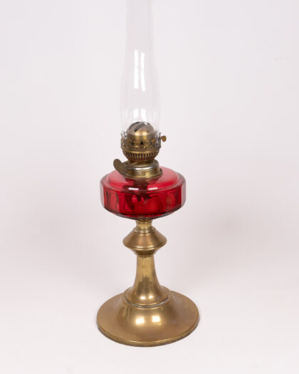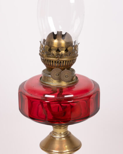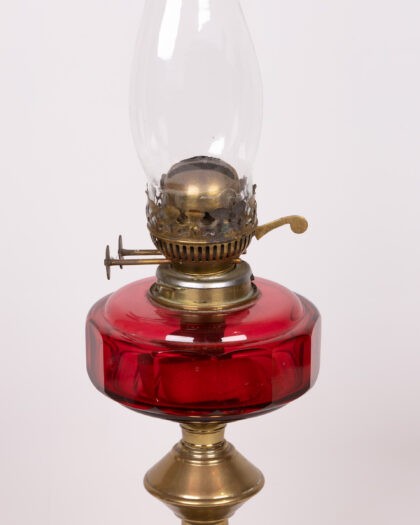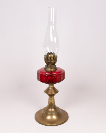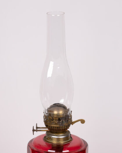 Vintage Floral Oil Lamp with white glass body, bronze metal base, and clear glass chimney. Decorative and functional lighting.
