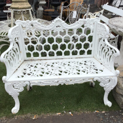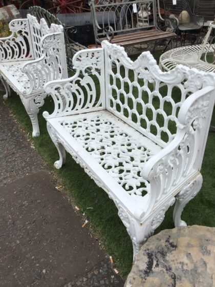 Pair of rustic white solid cast iron garden benches with signs of use and repair. Sturdy and very heavy. Ideal for your garden/outdoor area