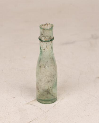 Antique pale green glass bottle. The bottle features a round base, a slightly tapered body, and a narrow neck with a distinctive ring. The glass has some residue and slight staining, indicative of its age and past use. A charming piece with character, perfect for display. 12cm high