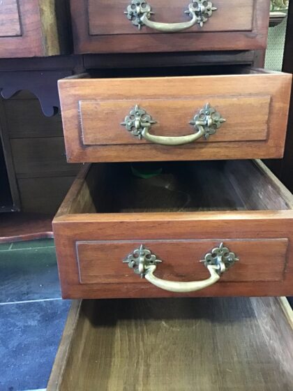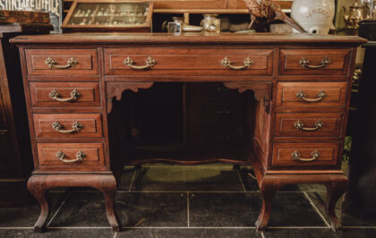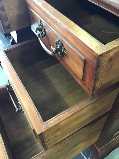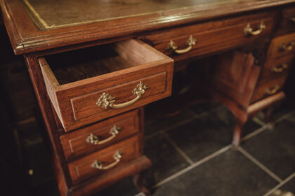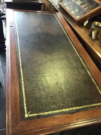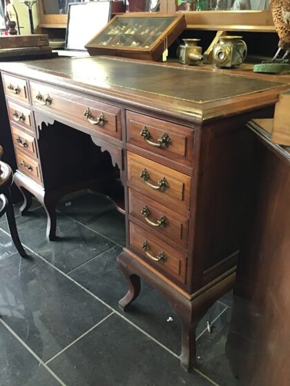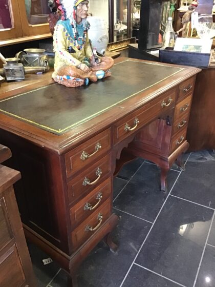 Mahogany desk with oak-lined drawers and a neat leather top surface.
